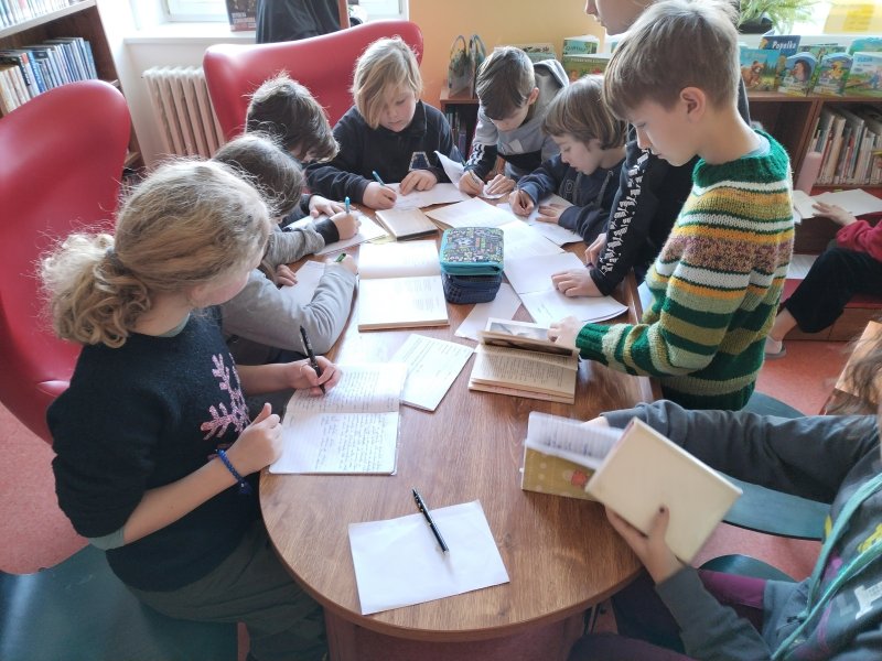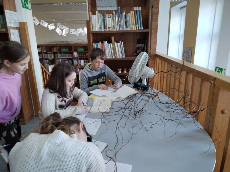 Při následné prohlídce jednotlivých čtenářských oddělení se začaly ozývat komentáře a otázky: „Jé, tuhle knihu máme doma.“ „Tu jsem četl, znáš ji?“ „Máte Neználka?“ „Z této knihy je ukázka v čítance.“ „Tolik knížek pohromadě jsem ještě neviděl.“ „Sem budu chodit o polední přestávce.“ „Našla jsem oddělení poezie. Tady si budeme vyhledávat ty básničky, jak jsme dostali za úkol.“ „Přišla nová manga?“ Kdo si myslel, že děvčata shánějí občerstvení v podobě tropického ovoce, byl na omylu. Manga je japonské označení pro komiks, doslova „humorné obrázky“. Je tištěna jedinou barvou (s občasnou výjimkou prvních stran knihy) a pozor – čte se opačným směrem - zprava doleva. Ano, v naší městské knihovně mangy mají. Dalším zážitkem bylo osahání si učebnice přírodopisu pro 5. ročník. Osahání v pravém slova smyslu, byla psaná Braillovým písmem. Nakonec došlo i na výše zmíněné básničky. Každý jsme si nějakou pěknou našel a opsal. Budeme s nimi ve škole dále pracovat.